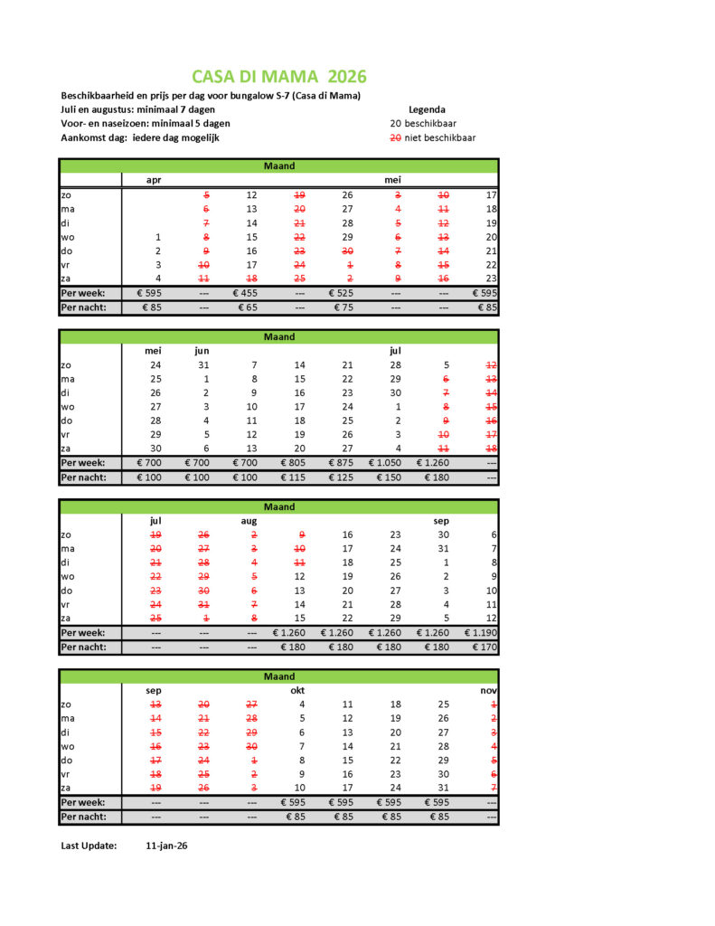 Hieronder vind je de beschikbaarheid en de prijs per week van Casa di Mama, bungalow S-7.
